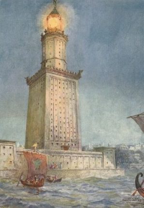 Op de kaart uit Duitsland staat de oude vuurtoren uit Alexandrië. Op internet is er veel informatie over te vinden. Voor zover bekend, was het de eerste vuurtoren die ooit werd gebouwd, 200 jaar B.C. en wordt de toren beschouwd als 1 van de zeven wereldwonderen. De toren droeg dezelfde naam als het kleine eilandje voor de kust van Alexandrië, waarop hij gebouwd was: Pharos.